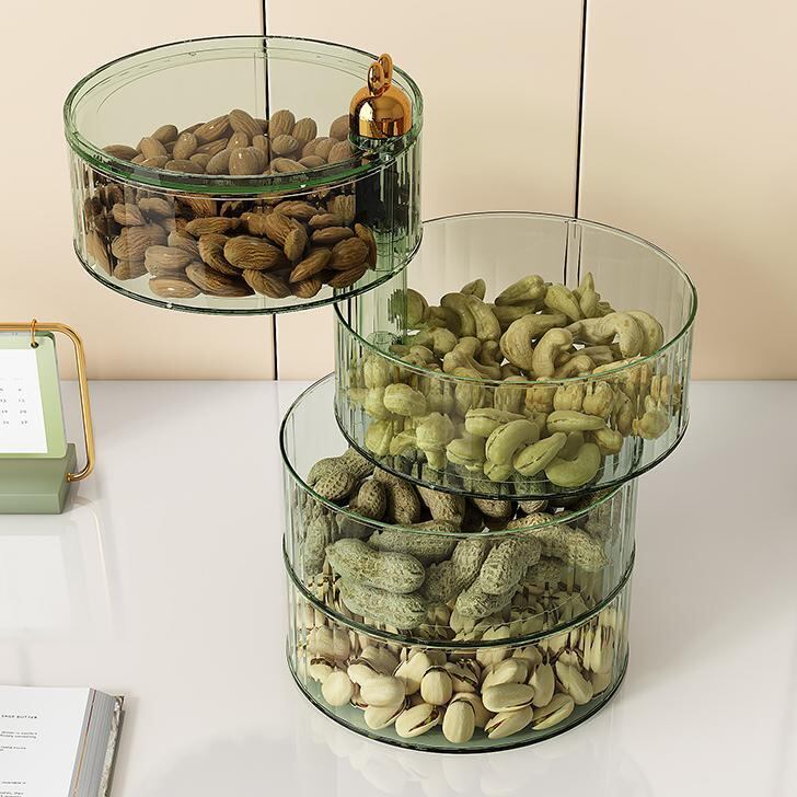 多層回転式設計でお菓子やナッツを分類して収納可能。