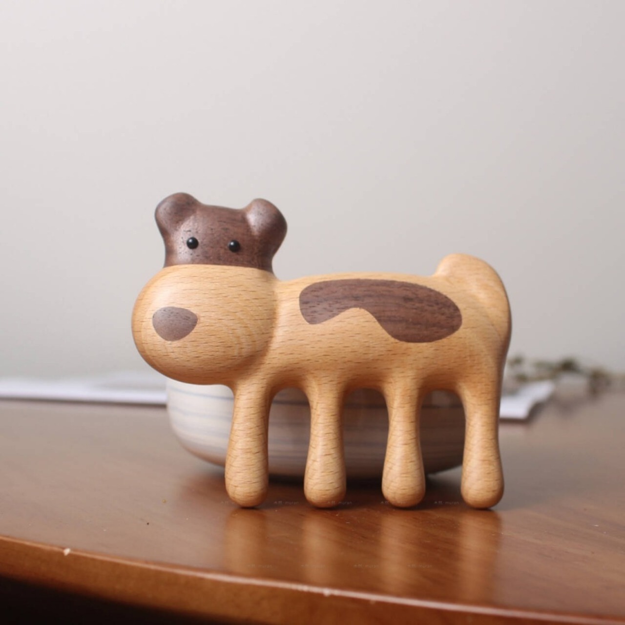 犬の形をした可愛いデザインの木製マッサージブラシです。