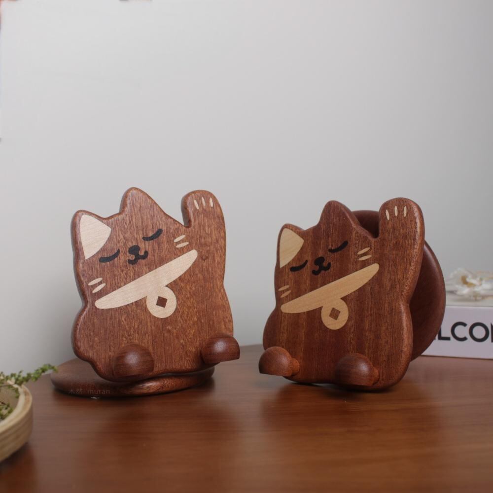 縁起の良い招き猫デザインが可愛い木製スマホスタンドです。