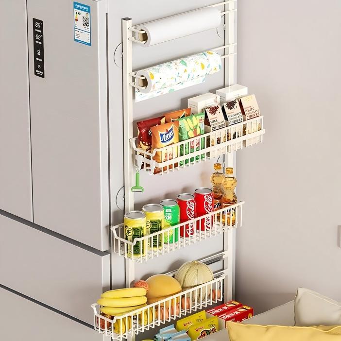 冷蔵庫の横やキッチンのすき間にぴったり収まる、スリムタイプの多層収納ラックです。