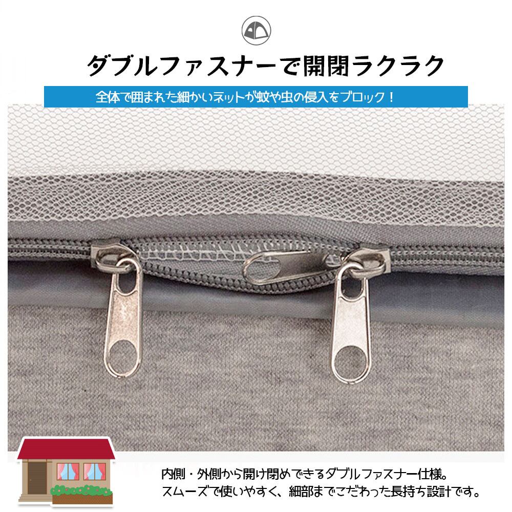 虫の侵入をしっかり防ぎつつ、空気はしっかり通す高密度メッシュ素材を採用。蒸れにくく、寝苦しい夏の夜も快適に眠れます。底面も細かいメッシュで、蚊やハエ、蜘蛛、ゴキブリなどの侵入を徹底的にガードします。